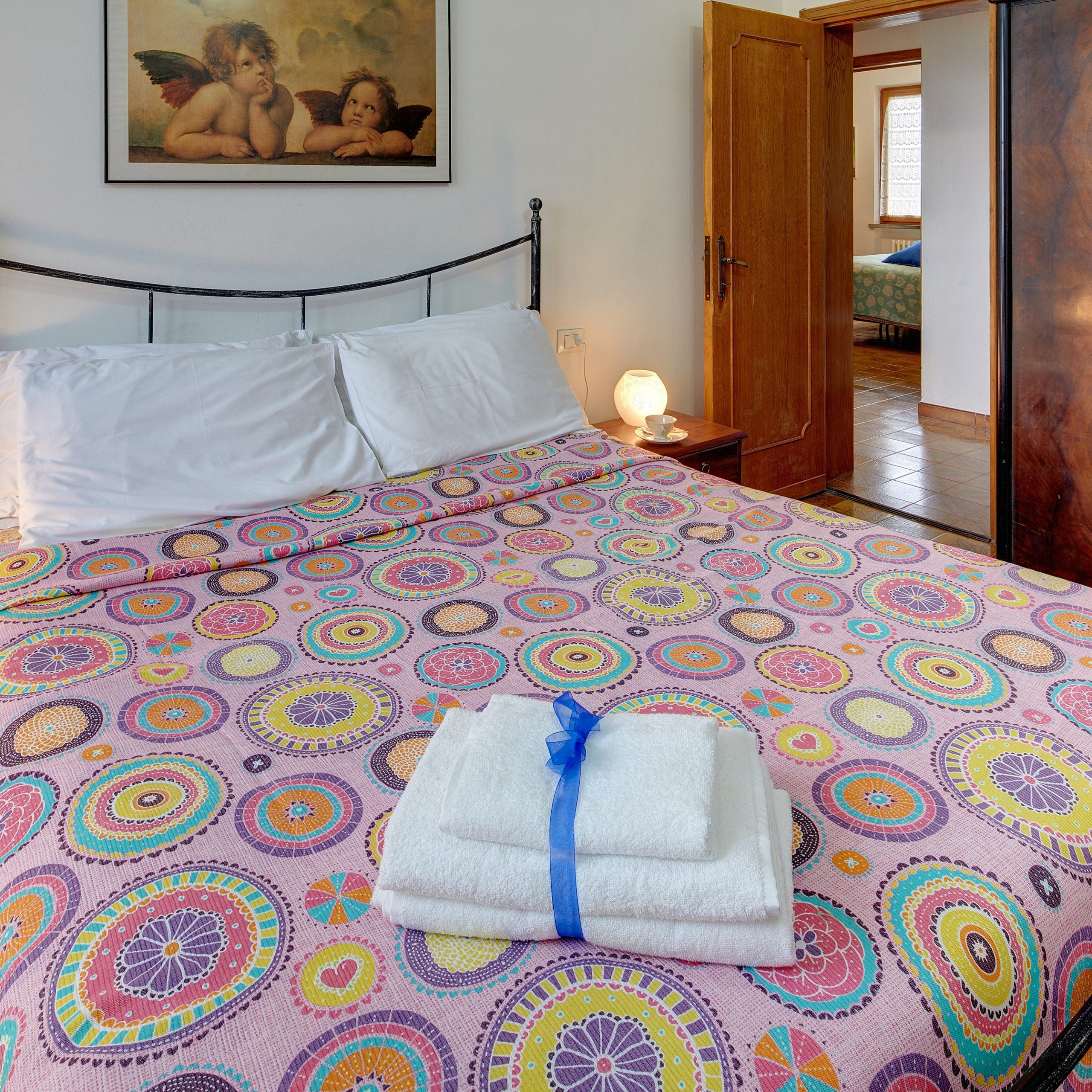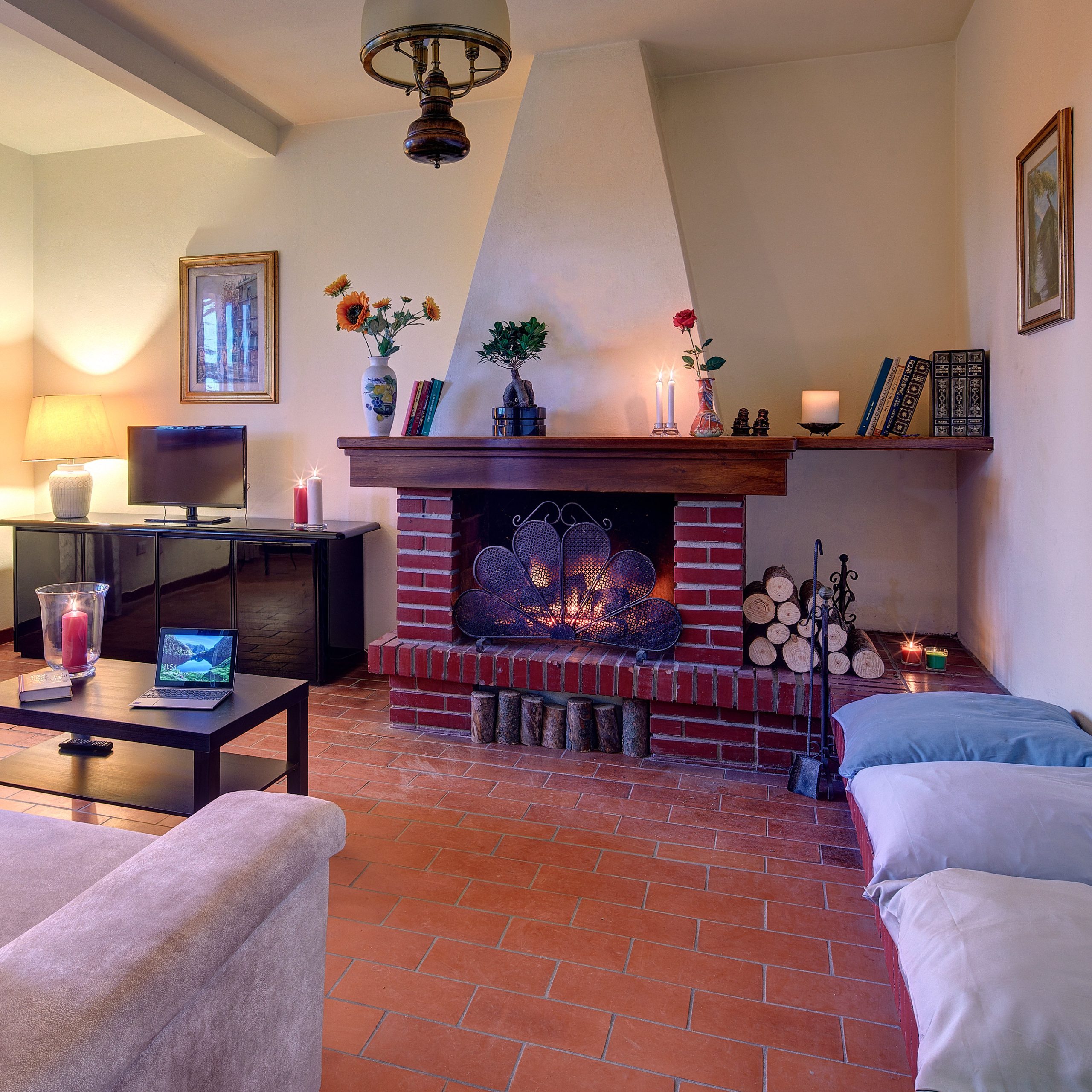 L’appartamento dispone di ampia sala con divano, camino e Smart TV, cucina attrezzata, lavatrice, tre camere matrimoniali con ventilatori a soffitto, bagno con box doccia e asciugacapelli. Presenti zanzariere in tutti i locali.