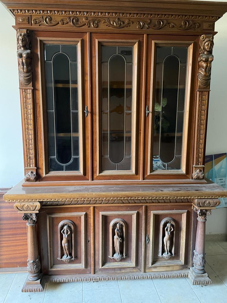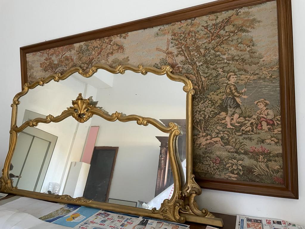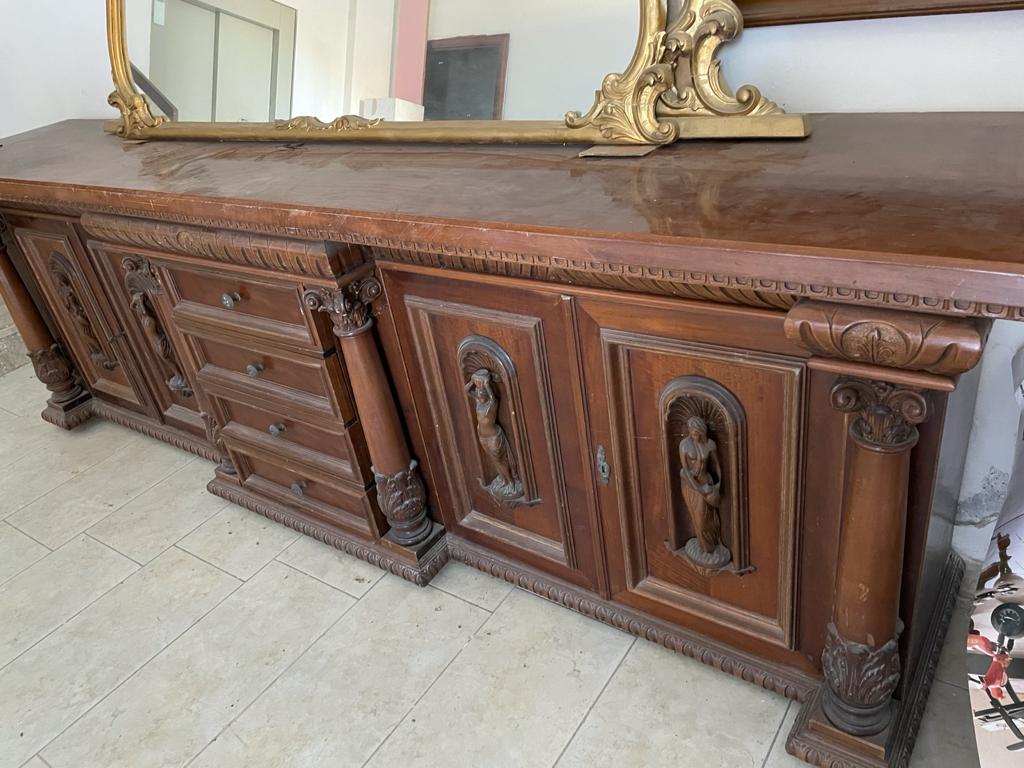 SET DI CREDENZA CON ALZATA, BUFFET e SPECCHIERE con statue ancelle intagliate in legno. Credenza legno massello misure L 172 cm, H 220 cm, mobile buffet misure: L 186 cm, altezza 90 cm, profondità 60 cm, più due specchiere in legno dorato misure L158 cm h H80 cm e L195 cm x H120 cm. Vendita anche scorporata dalle specchiere