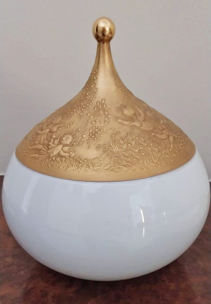 L'oggetto è caratterizzato da un raffinato decoro in rilievo interamente rifinito in oro, che raffigura scene dell'omonima opera di Mozart con cherubini e motivi floreali. Un pezzo di altissimo design vintage (anni '70/'80), perfetto per collezionisti o per impreziosire una tavola elegante.