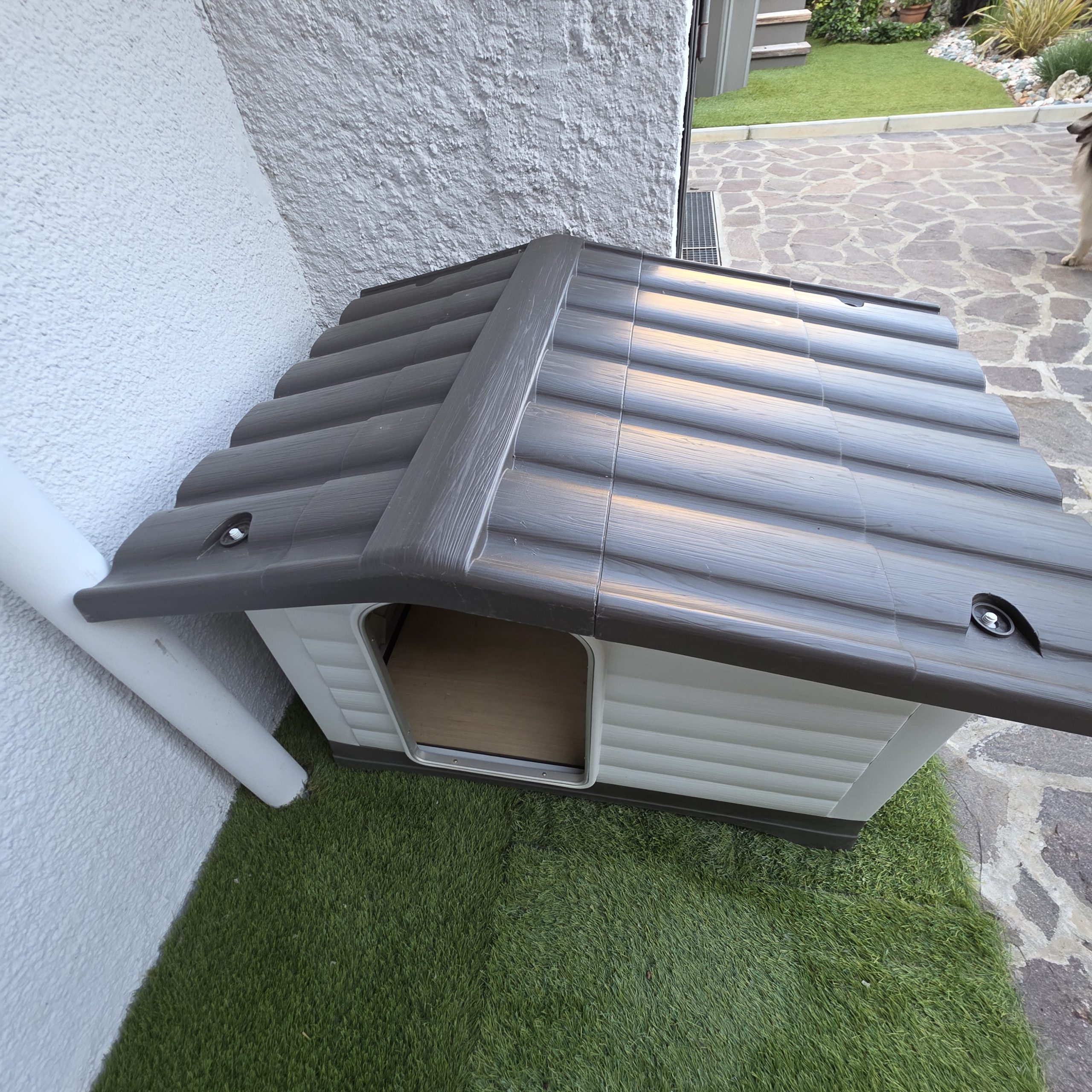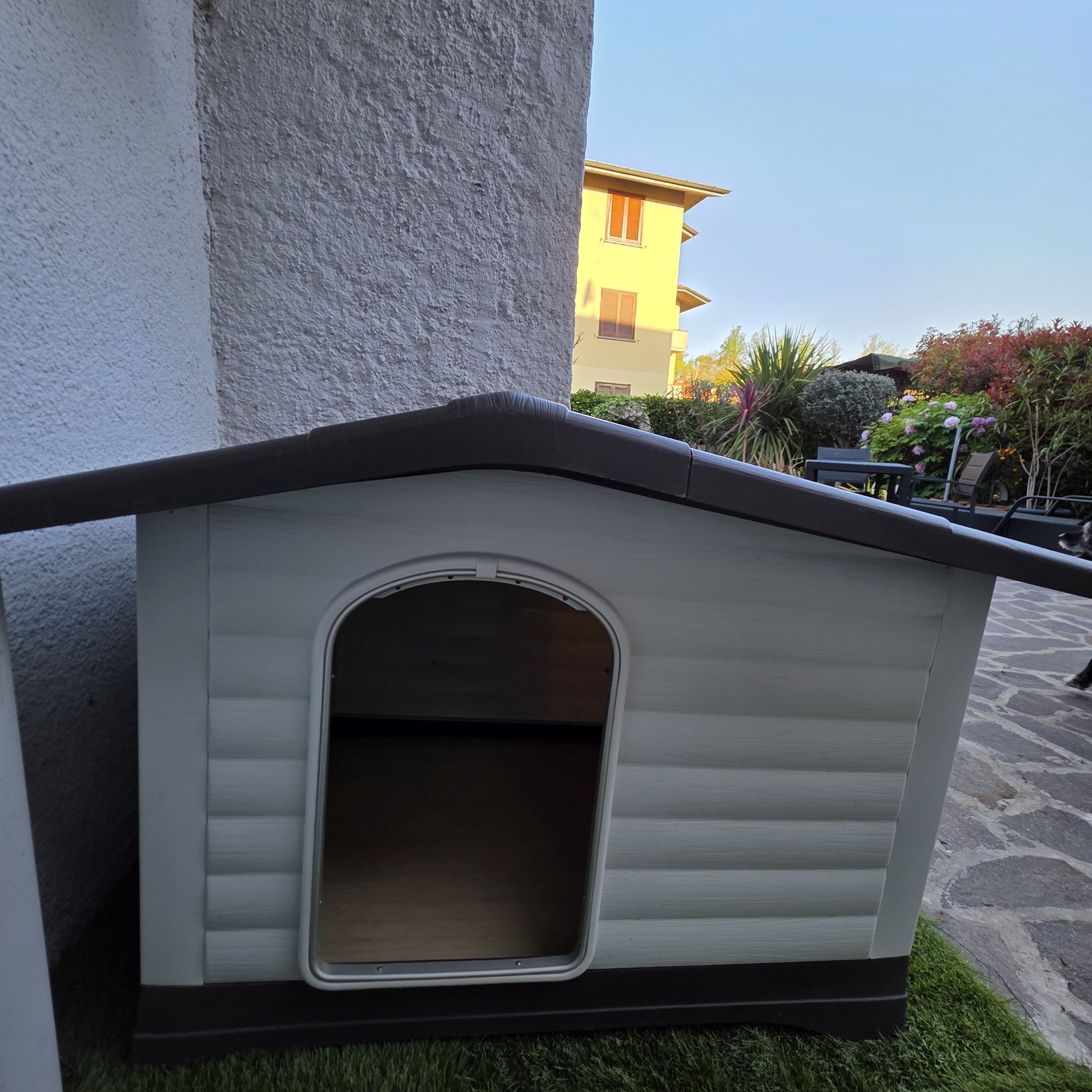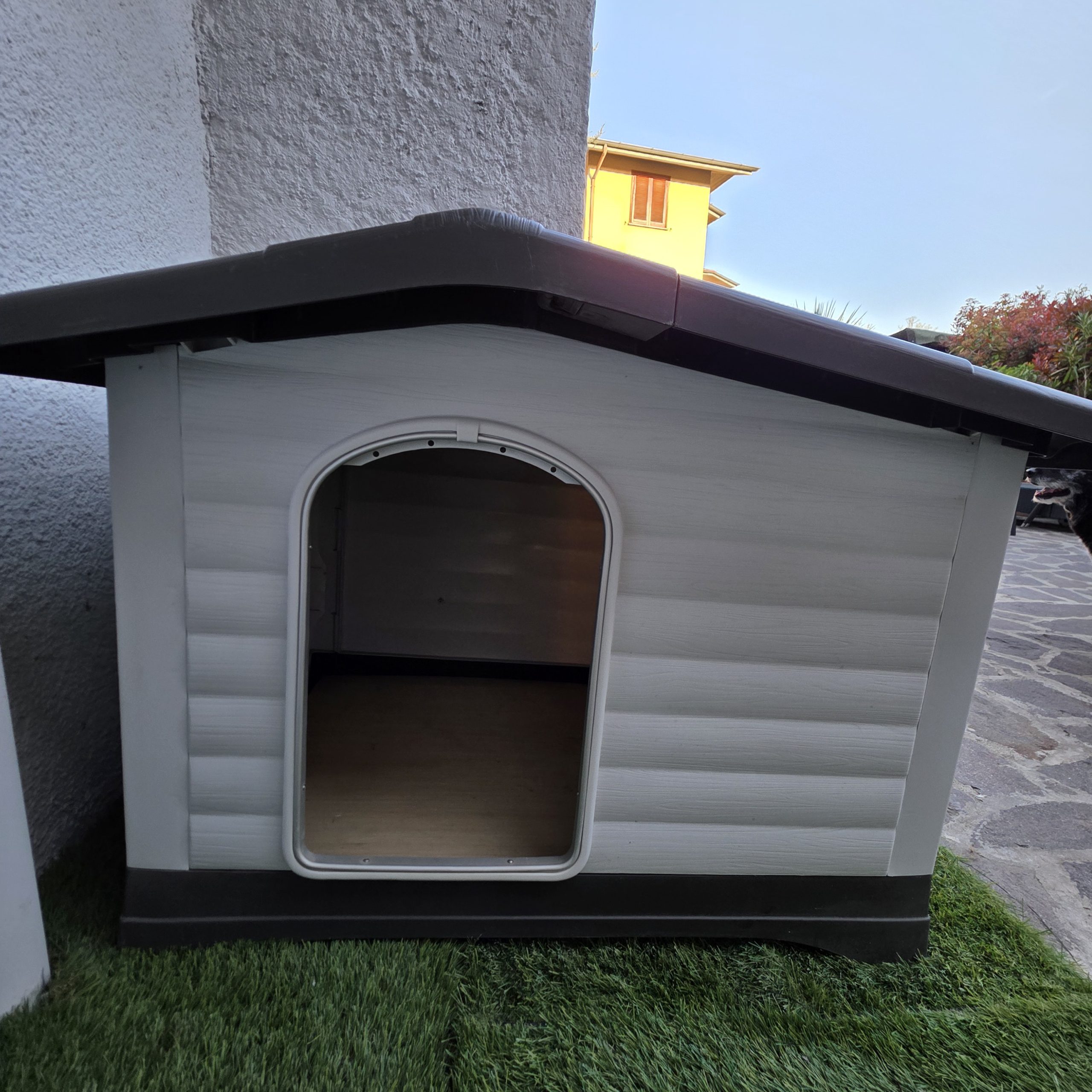 Cuccia da esterno in resina termoplastica facile da smontare e pulire. Misure cm 100X70 altezza cm 80. Misura porta cm 45 larghezza cm 30
