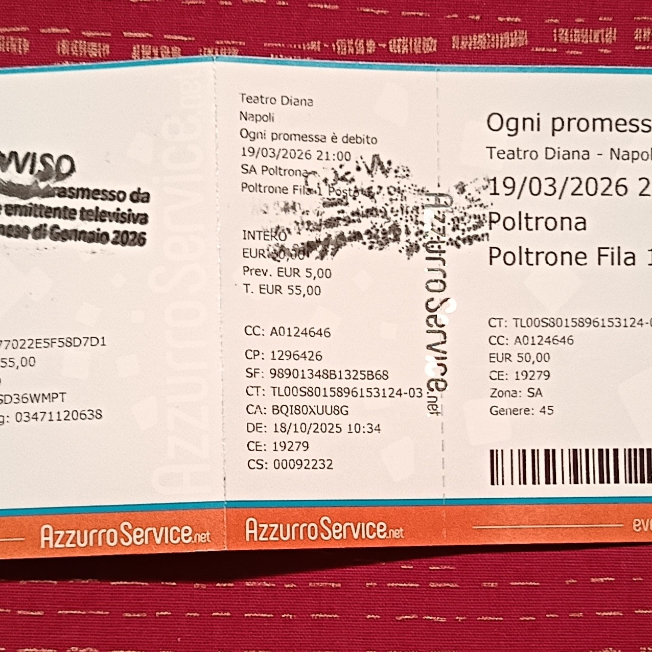 Vendo 2 biglietti prima fila platea per il Teatro Diana (Napoli) per lo spettacolo del 19 marzo alle ore 21