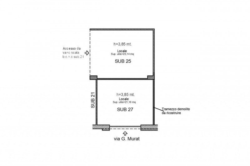 Quest&rsquo,immobile viene venduto tramite asta online. Quota di 1/2 di due locali siti a Lamezia Terme (CZ) in via G. Murat 88 nell&rsquo,incrocio con via S. Foderaro in una zona a prevalente destinazione residenziale e con attività, commerciali. I beni si trovano nel piano terra di un palazzo costruito nei primi anni &rsquo,80 e costituito da tre piani fuori terra. I locali sono privi di finestre senza servizi igienici. Il locale del subalterno 25 ha accesso dal vano scala comune. Il locale del subalterno 27 è, collegato con un subalterno adiacente non oggetto di vendita ove è, posto l&rsquo,unico accesso. L&rsquo,altezza interna dei locali è, di circa 3 85 m. I beni risultano non conformi. Per maggiori informazioni vedasi documentazione allegata. Superficie commerciale subalterno 25: 26 22 mq Superficie commerciale subalterno 27: 23 66 mq Proprietà, 1/2 di: (CF): Foglio 32 - Particella 931 - Subalterno 25 - Cat. C/2 (CF): Foglio 32 - Particella 931 - Subalterno 27 - Cat. C/3 Quimmo.it: iniziativa tech del Gruppo illimity specializzata nell&rsquo,intermediazione digitale di beni immobili provenienti da tribunali nuovi sviluppi immobiliari financial institutions e libero mercato. Da oltre 10 anni Quimmo.it è, il portale specializzato nella compravendita di immobili tramite asta giudiziaria. Il portale è, infatti iscritto nel Registro Gestori della vendita telematica e nell&rsquo,elenco dei siti web autorizzati allo svolgimento della pubblicità, legale. Con Quimmo puoi scegliere tra migliaia di immobili di ogni tipo e partecipare alle aste online per acquistare la soluzione più, adatta alle tue esigenze. Affidati all&rsquo,esperienza decennale dei nostri esperti e richiedi l&rsquo,assistenza gratuita per la presentazione e compilazione dell&rsquo,offerta. Contattaci subito. classe energetica in fase di definizione IPE: 0 00 kWh/m3anno { 161025 *68967 *07-4644865 *07 *0-1 }